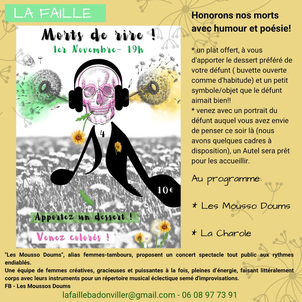 Soirée Morts de Rire avec les ’’Mousso Doum’’ et ‘‘La Charole’’. Apportez les photos de vos défunts, préparez leur dessert préféré ou partagez leur histoire ou leur chanson…