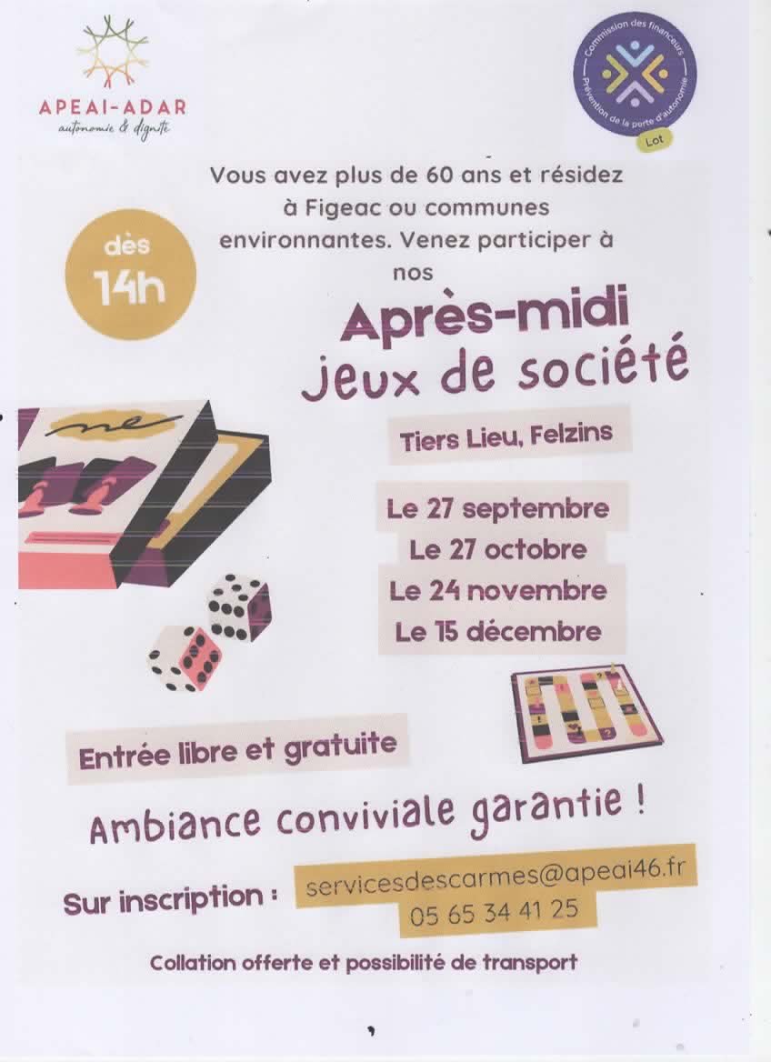 Inscription : par courriel à servicesdescarmes@apeai46.fr ou par téléphone au 05 65 34 41 25.