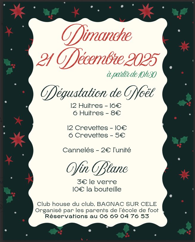 Les parents de l'école de foot vous proposent une dégustation de Noël, le dimanche 21 décembre 2025 à 10h30 au club house de Bagnac.