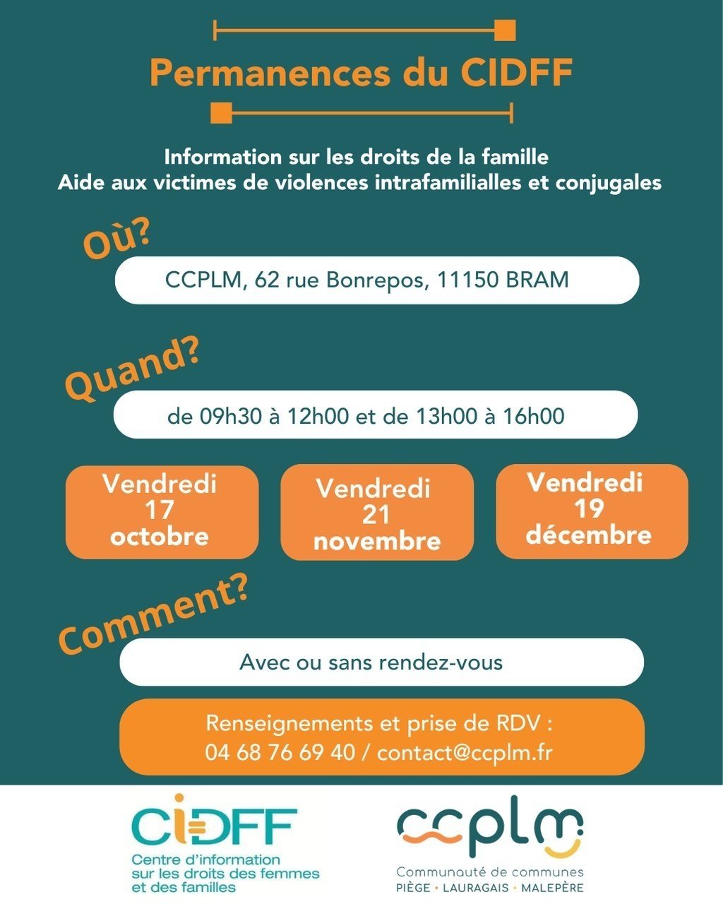 Participez aux permanences du CIDFF, Centre d'Information sur les Droits des Femmes et des Familles, le VENDREDI 19 DECEMBRE de 9h30 à 12h et de 13h à 16h dans les locaux de la CCPLM.