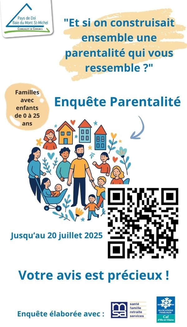 👉 La Communauté de communes du Pays de Dol et de la Baie du Mont-Saint-Michel, en partenariat avec la CAF d’Ille-et-Vilaine et la MSA Portes de Bretagne, lance une grande enquête parentalité.