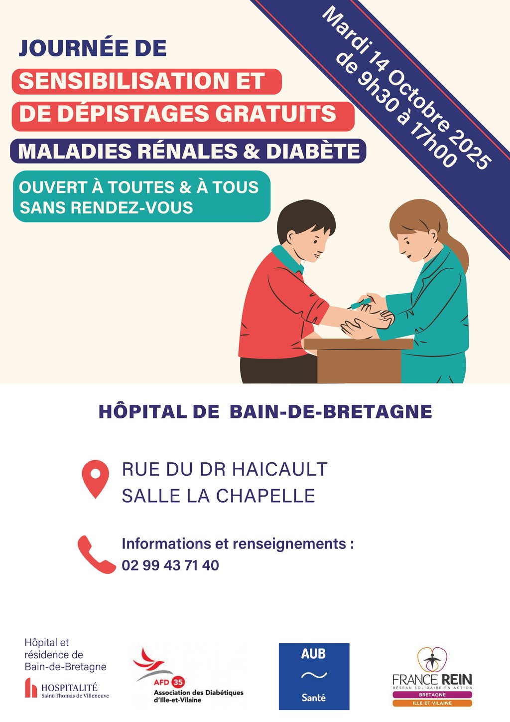 Les Associations des insuffisants rénaux chroniques et des diabétiques d’Ille-et-Vilaine s’unissent pour agir avec l’hôpital St Thomas de Villeneuve et l’AUB Santé, en collaboration avec la ville de Bain de Bretagne.