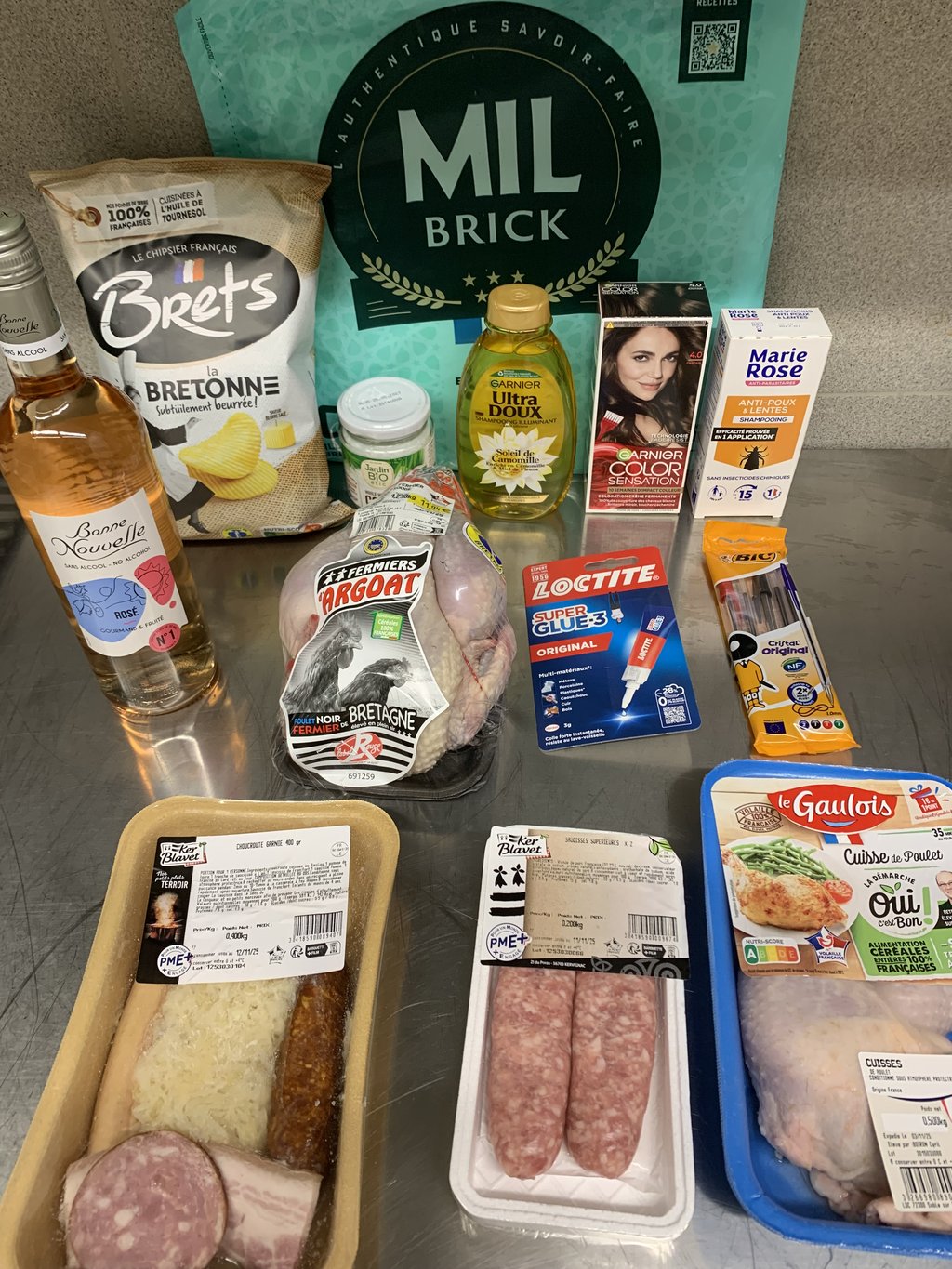 Poulet, saucisses x2, feuille de brick, choucroute, huile de coco bio, chips Bret's, bretonne, rosé sans alcool, bière Leffe sans alcool, shampooing antipoux et lentes, stylo bic, colle super glue3.....