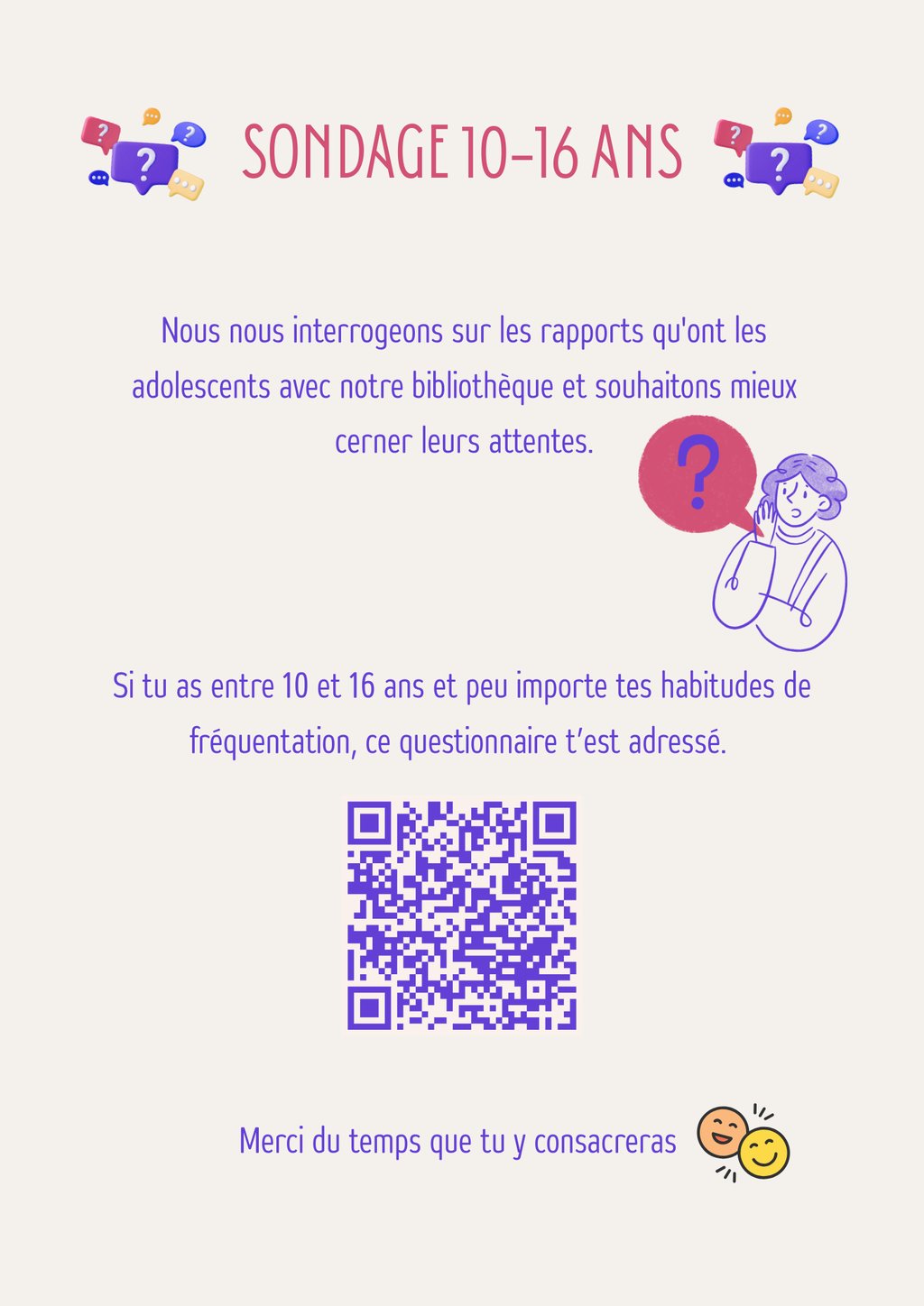 Si tu as entre 10 et 16 ans et peu importe tes habitudes de fréquentation, ce questionnaire t'est adressé. (temps estimé pour le compléter : moins de 5 minutes)