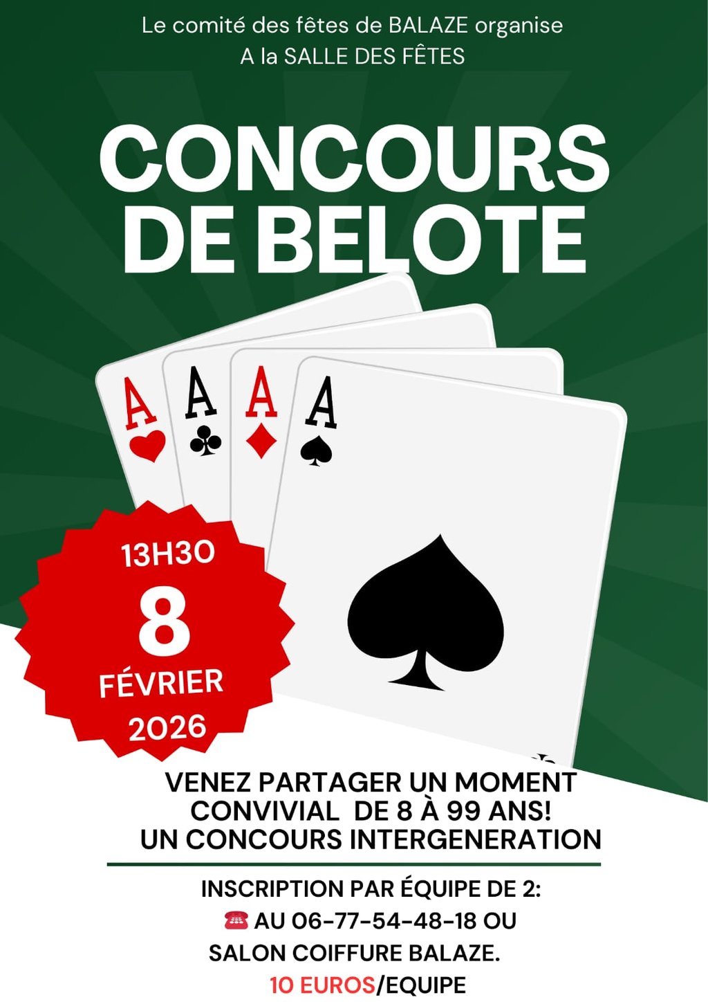 Le comité des fêtes organise un concours de belote le dimanche 8 février à 13h30 à la salle des fêtes.