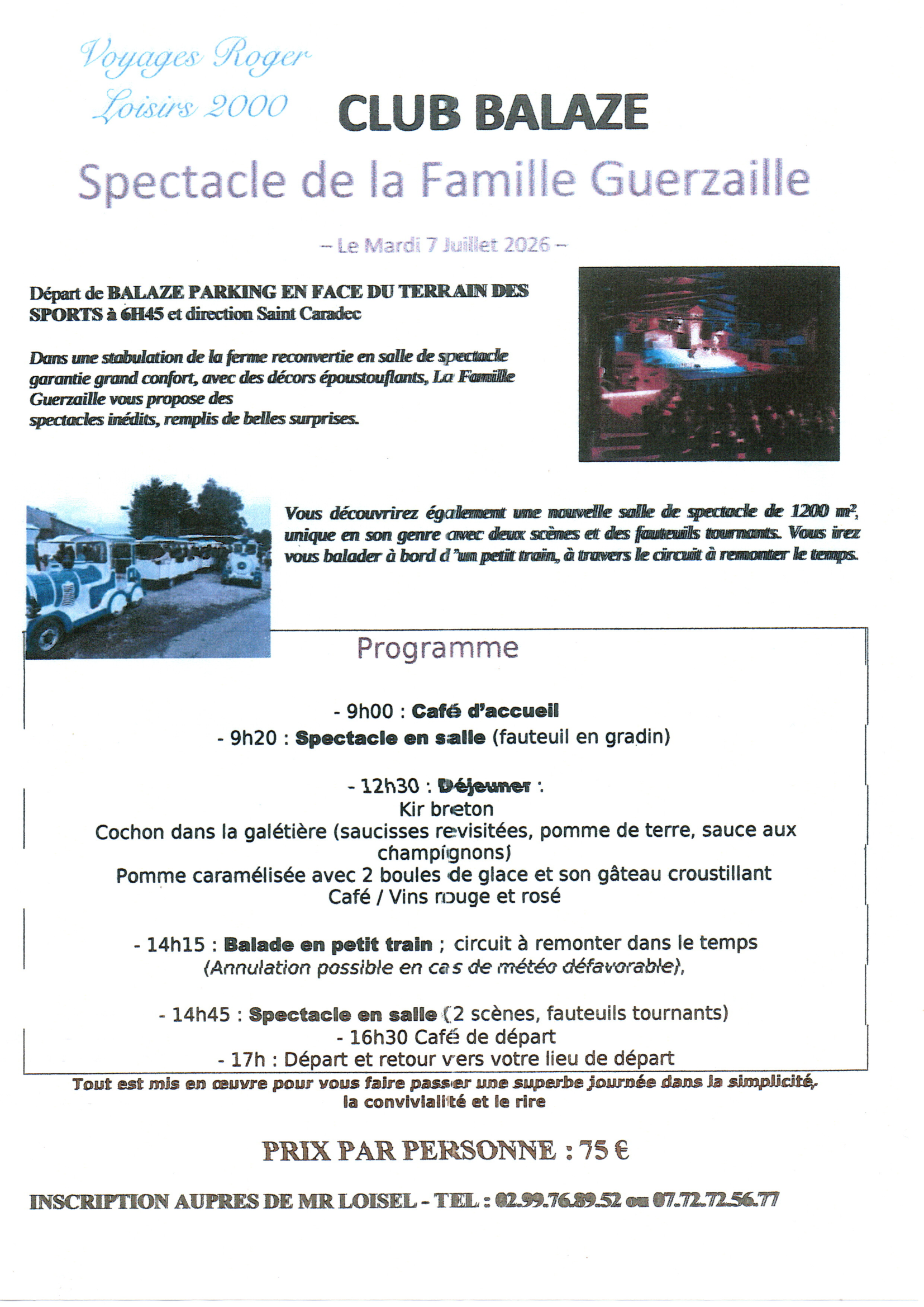 Spectacle Marie Guerzaille mardi 07 juillet 2026 : Départ à 6 heures 45, parking terrain des sports. Inscription auprès des membres du bureau. Ci-joint le programme .