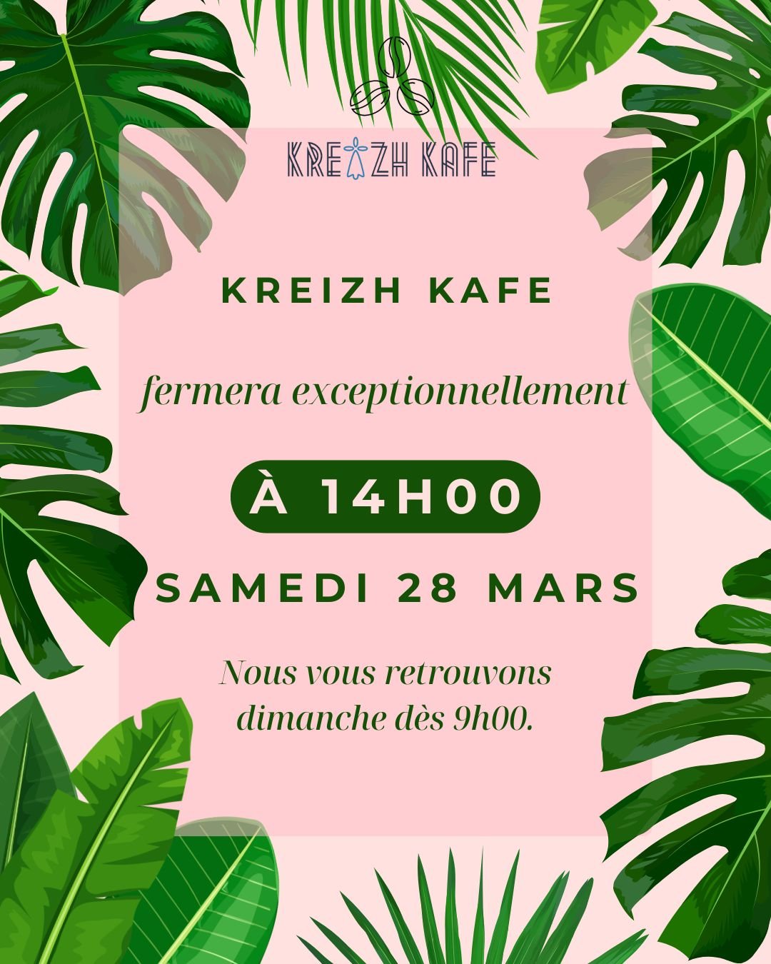 Nous fermerons le café exceptionnellement à 14h, le samedi 28 mars.