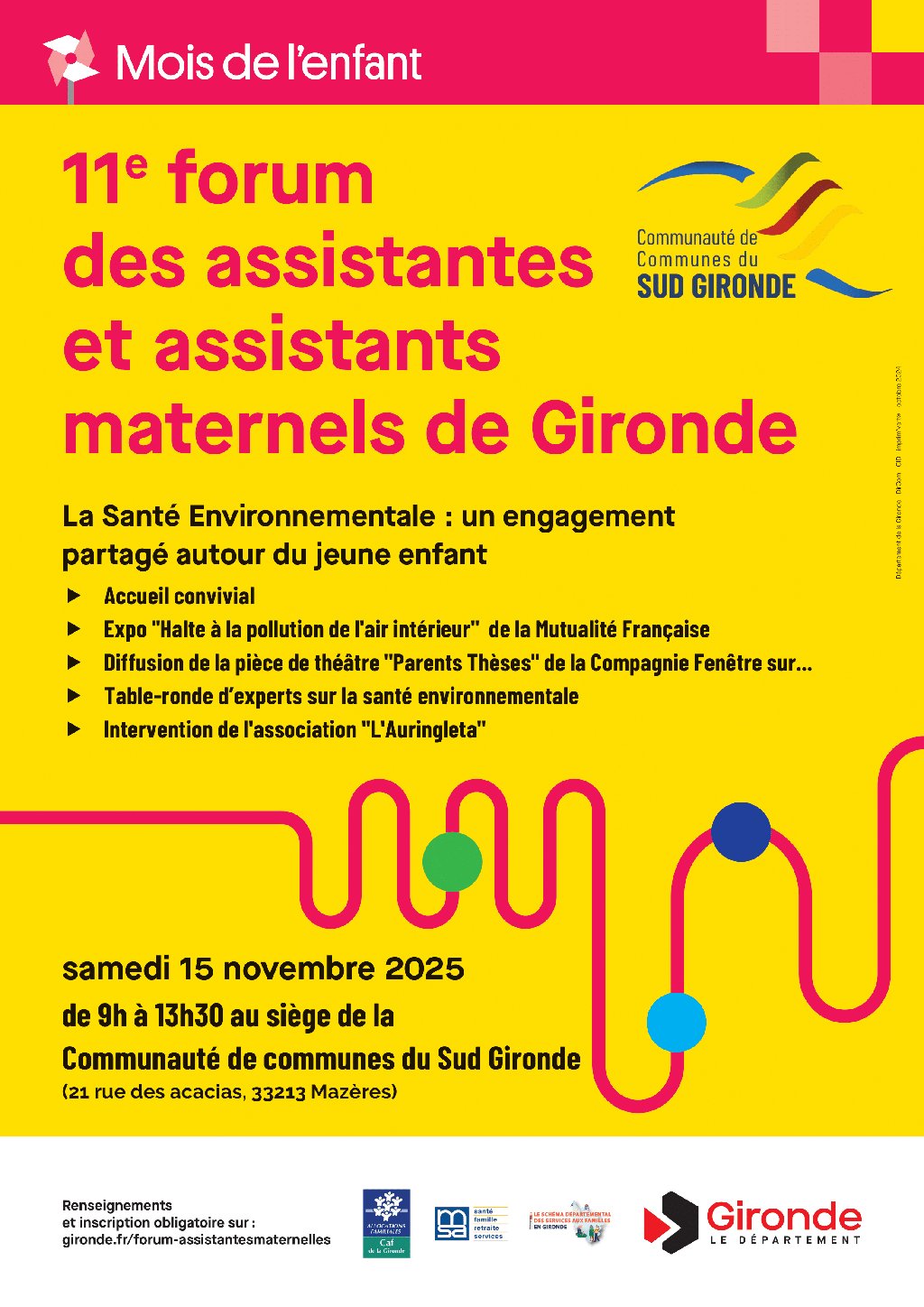🗣 Dans le cadre du Schéma Départemental de Services aux Familles, les partenaires institutionnels – la CAF, le Département et la MSA – organisent chaque année le Forum des assistantes et assistants maternels de Gironde. Cette année marque la 11ème édition qui se tiendra le samedi 15 novembre 2025 de 9h à 13h30.
