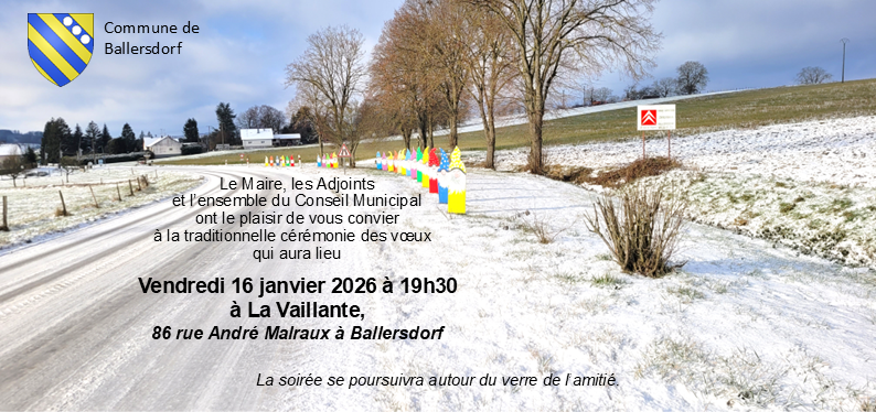 L'ensemble de la population de Ballersdorf est cordialement invitée à la cérémonie des vœux qui se déroulera vendredi 16 janvier 2026 à 19h30 à la Vaillante.