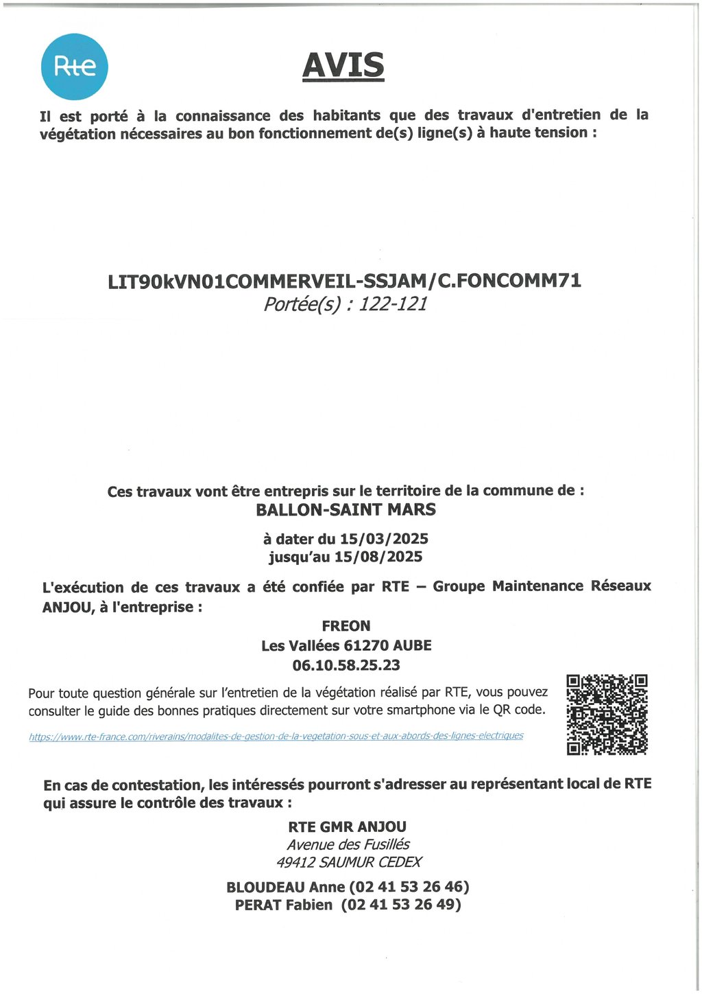 Des travaux d'entretien de la végétation nécessaires au bon fonctionnement des lignes à haute tension sont entrepris sur notre territoire (Ballon-Saint Mars) à partir du 15/03/2025 jusqu'au 15/08/2025.