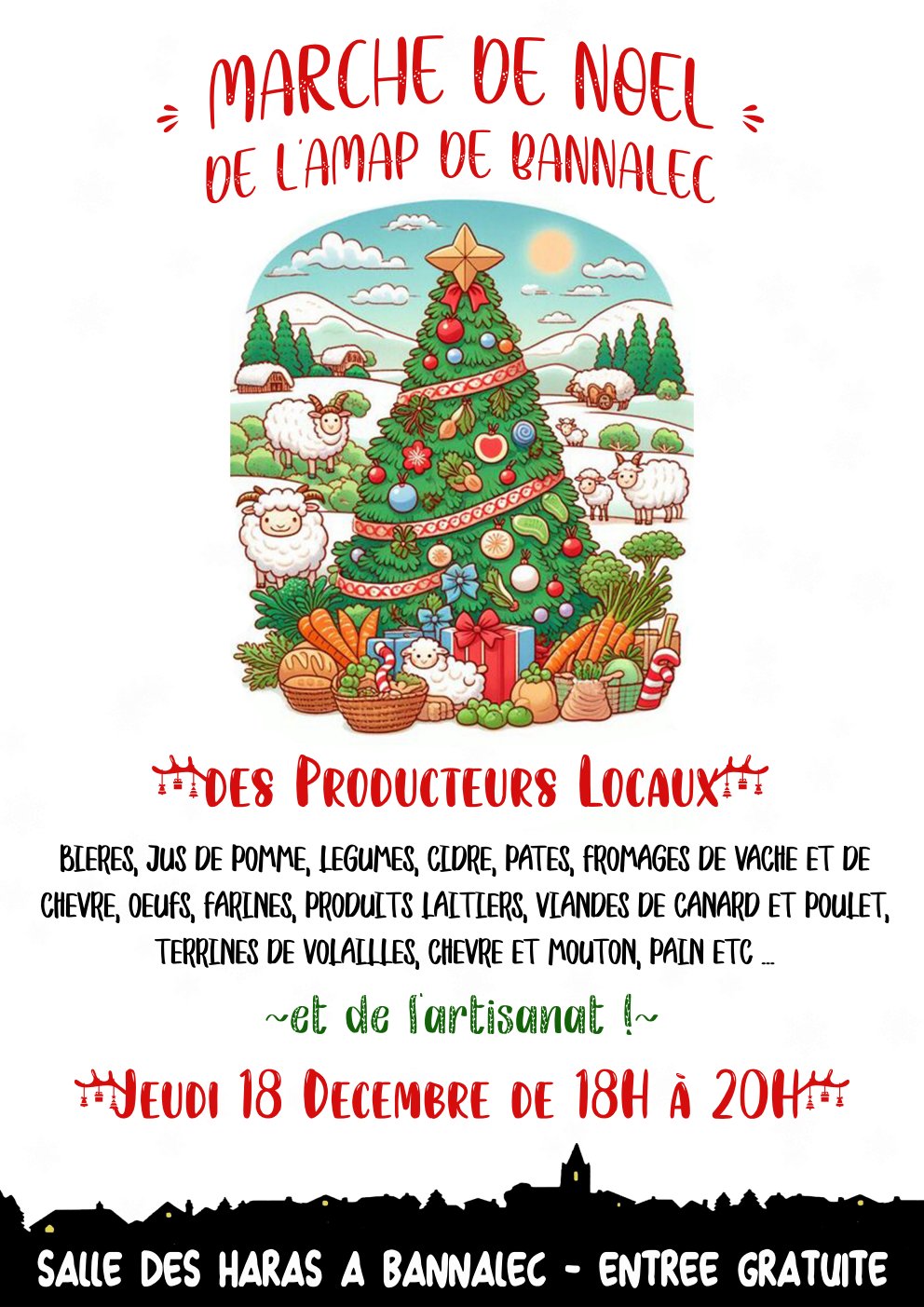 Rendez-vous à la Salle des Haras à Bannalec le Jeudi 18 décembre de 18h à 20h pour le Marché de Noël de l'AMAP et découvrez une variété de produits locaux (bières, fromages, viandes, légumes, etc.) ainsi que de l'artisanat, avec une entrée gratuite.