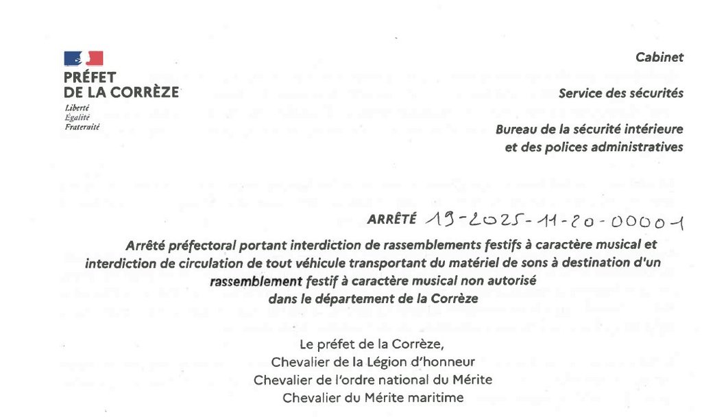 Arrêté préfectoral interdisant les rave partys ou le transport de matériel dédié à ce genre de rassemblement.