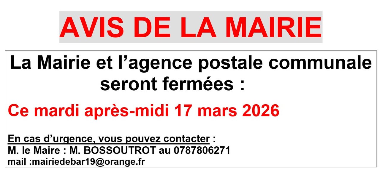 Mairie et agence fermées cet après-midi.