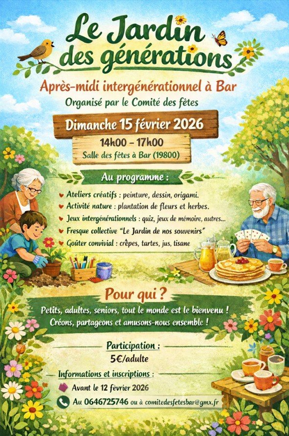 Le comité des fêtes de Bar organise une animation intitulée " Le jardin des générations" le dimanche 15 février après-midi. Voir flyer.