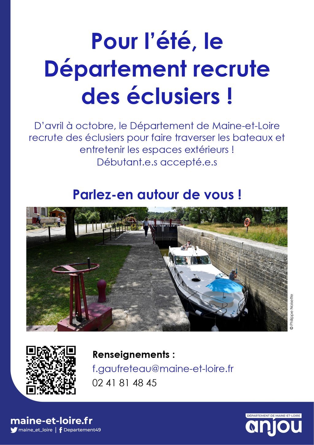 Comme chaque année, le Département du Maine et Loire (service des rivières et domaine public fluvial) vont recruter des éclusiers remplaçants saisonniers.