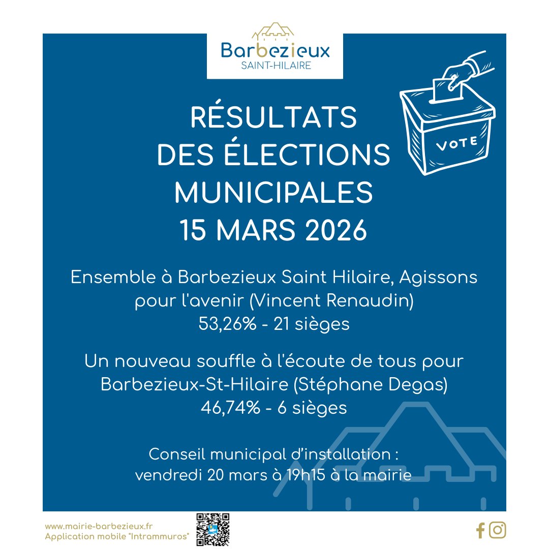 - Ensemble à Barbezieux Saint Hilaire, Agissons pour l’avenir (Vincent RENAUDIN) : 931 voix, soit 53,26% des suffrages exprimés