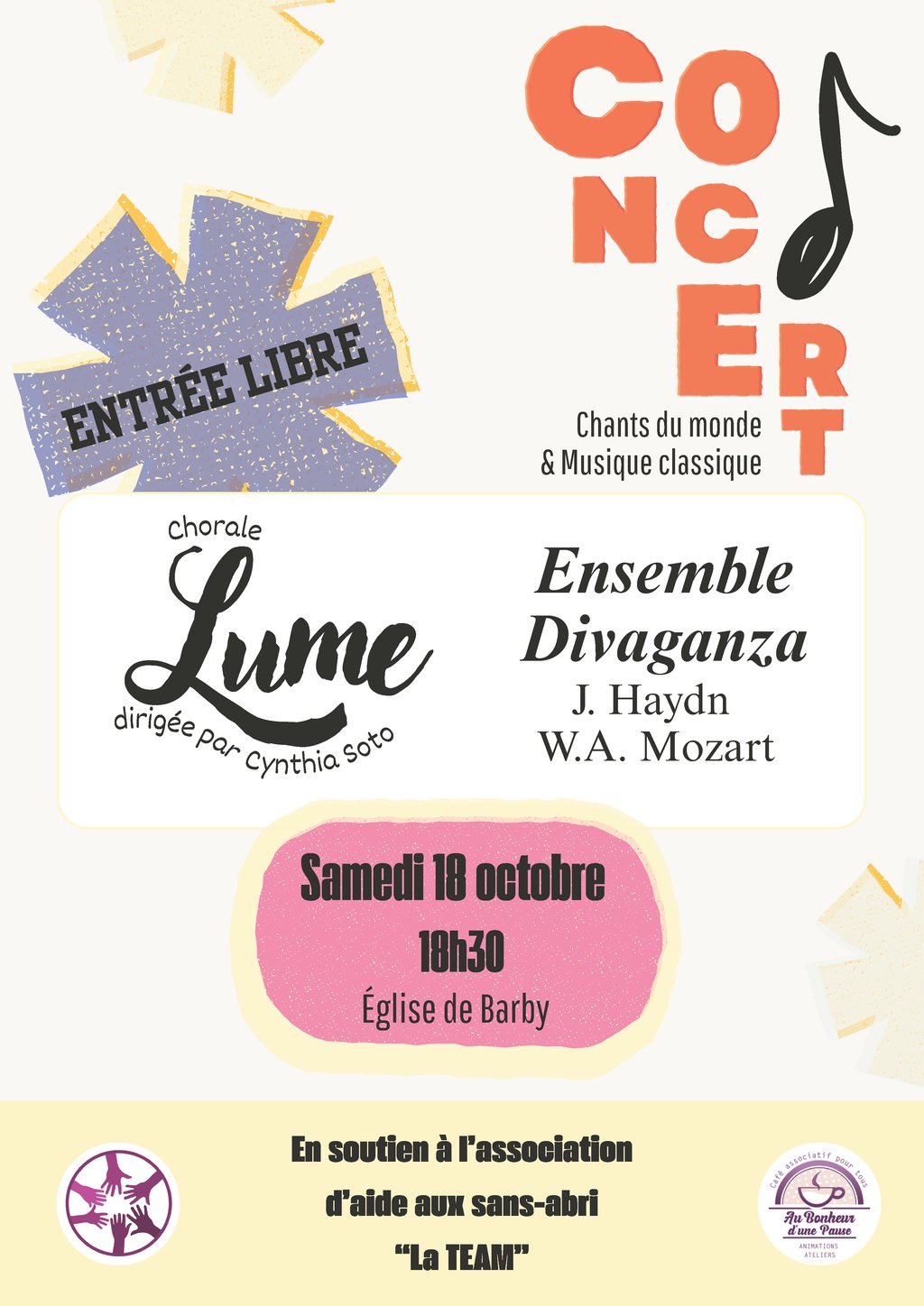 Ce concert est au profit et en soutien à l'Association d'aide aux sans-abri "La TEAM".