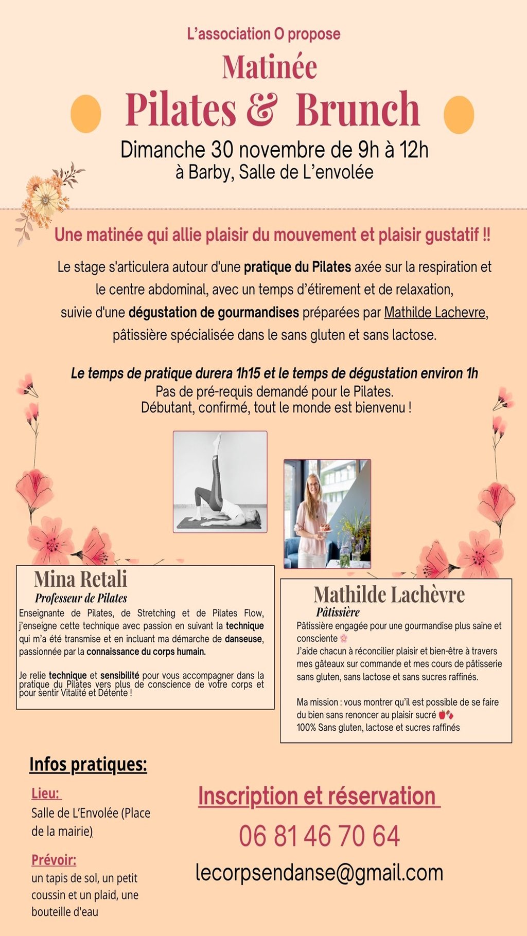 L'Association O propose une matinée Pilates § Brunch le dimanche 30 novembre de 9h à 12h à la salle de l'Envolée.