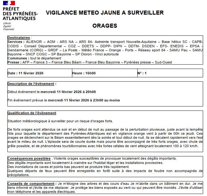 VIGILANCE JAUNES ORAGES 11 février 2026