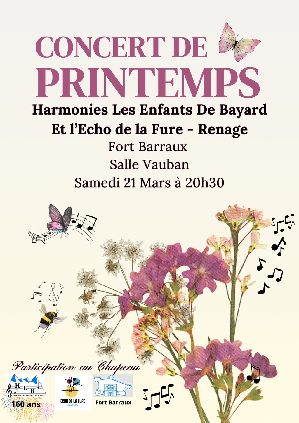Comme de coutume, l'orchestre d'harmonie Les Enfants de Bayard de Pontcharra sera très heureuse de vous présenter son tout nouveau programme 2026 lors du Concert de Printemps le Samedi 21 Mars à la salle Vauban au Fort Barraux à 20h30.