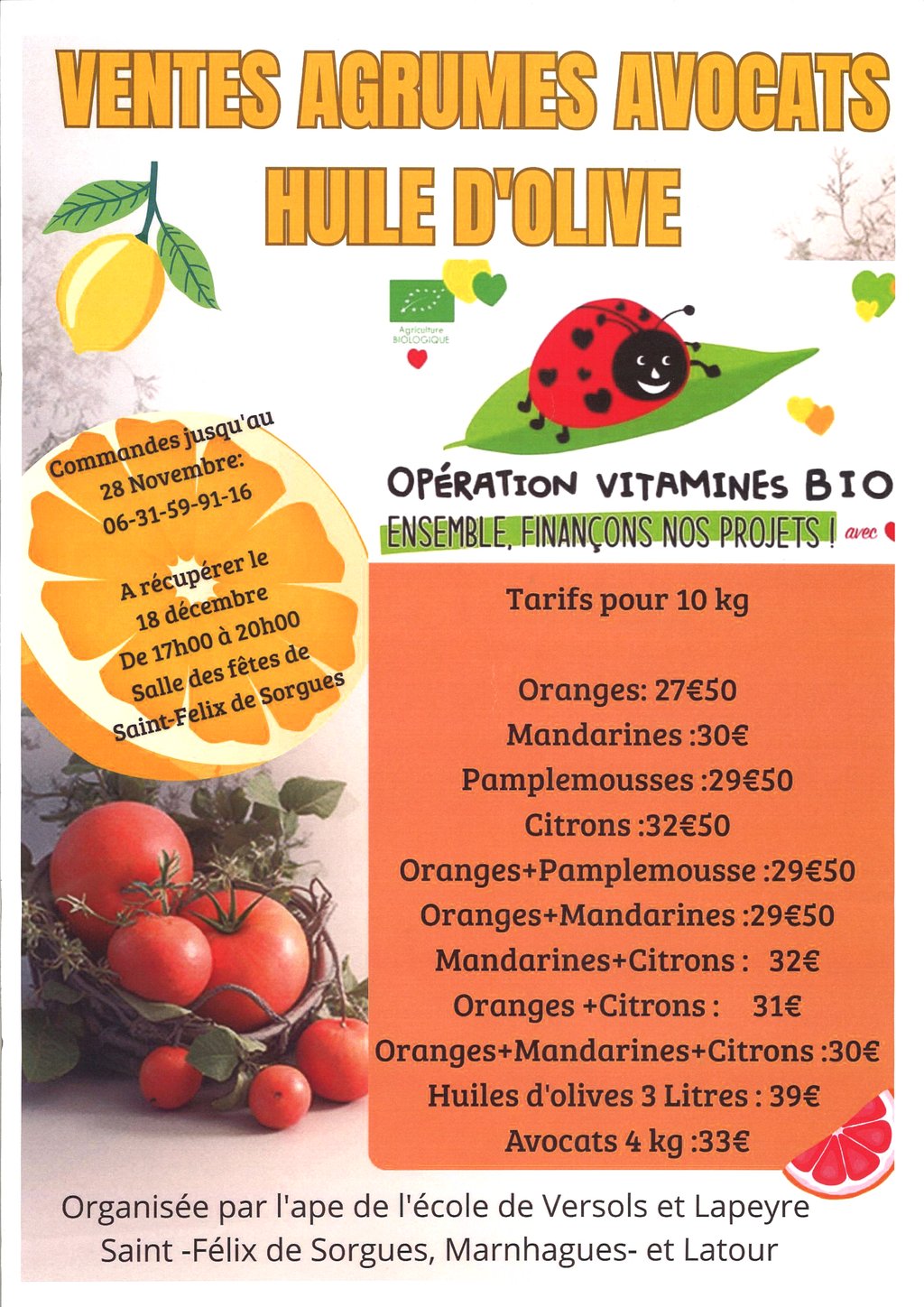 Vente d'agrumes, avocats et Huile d'Olive Bio d'Espagne proposés par l’APE Versols – Lapeyre – Saint-Félix-de-Sorgues – Marnhagues et Latour 🌞