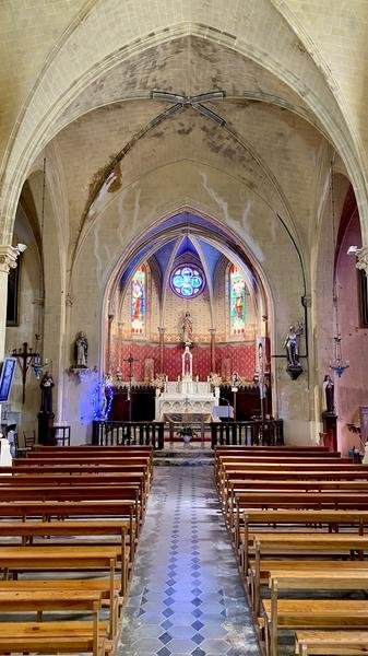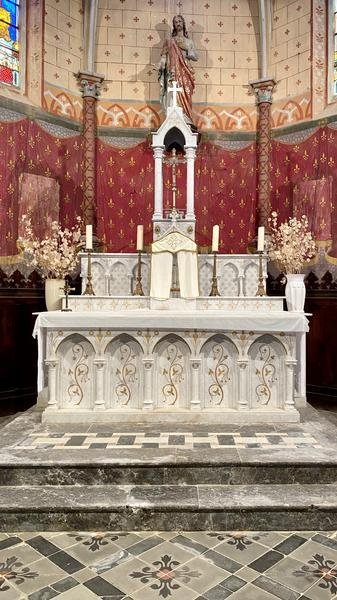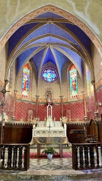 Le sanctuaire, en croix latine, abrite une nef unique voûtée d’ogives, éclairée par six vitraux colorés. Les chapelles latérales dédiées à Notre-Dame et à Saint-Roch, ainsi que le chevet polygonal orné de peintures polychromes, enrichissent la visite. Le maître-autel en marbre blanc, décoré d’arcatures ogivales et de dorures végétalisantes, constitue l’un des trésors de l’édifice.