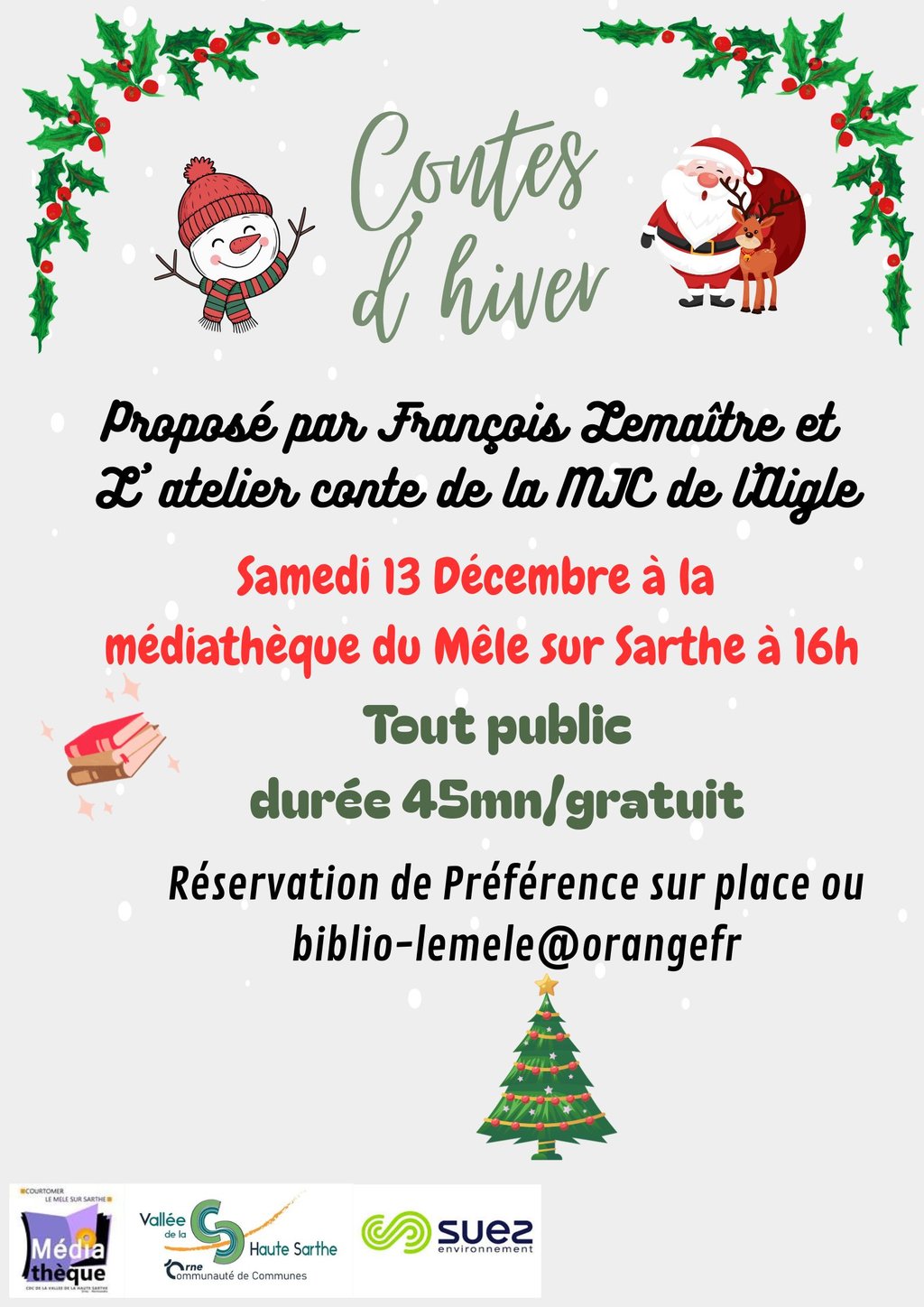Contes d'hiver proposé par François Lemaître et l'atelier conte de la MJC de l'Aigle samedi 13 décembre à 16h (durée 45 min) à la médiathèque du Mêle sur Sarthe