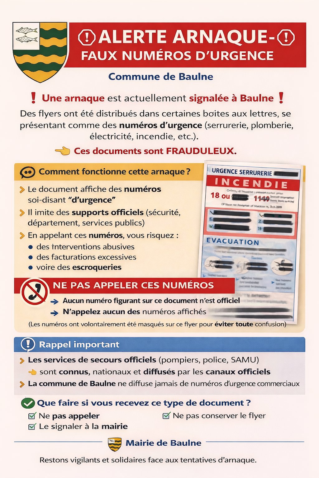 Faites attention, certains Baulnois ont reçu dans leurs boites aux lettres un flyer de numéros d'urgence, c'est une arnaque !