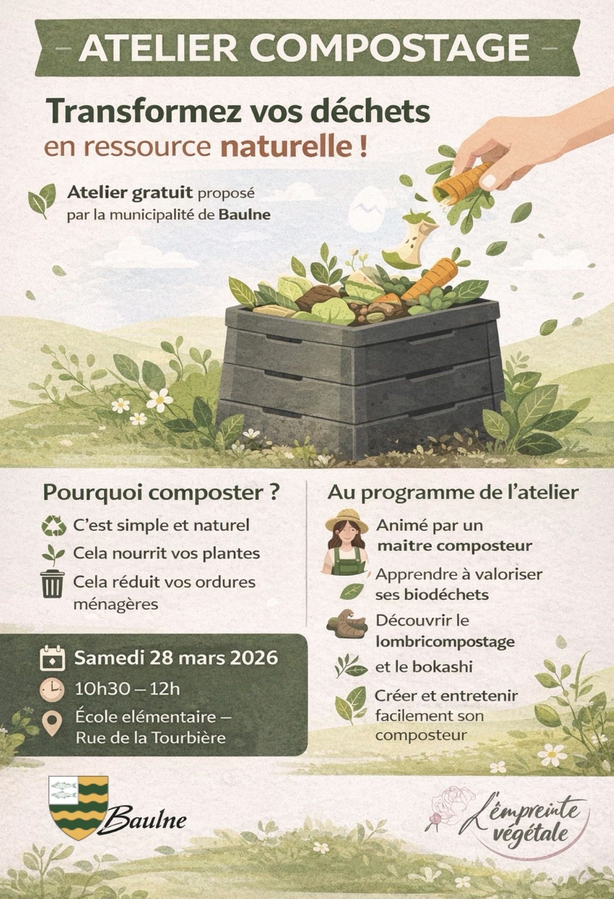 Comme chaque année, la municipalité de Baulne vous propose une formation gratuite au compostage pour apprendre à valoriser vos biodéchets et réduire vos ordures ménagères.