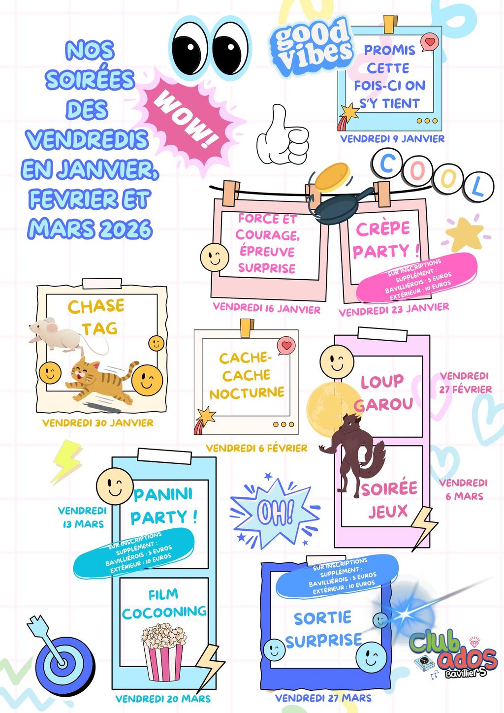 Programme des soirées du Vendredi de Janvier à Mars 2026 pour les ados !