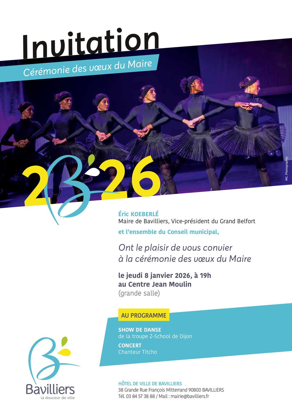 Éric Koeberlé, Maire de Bavilliers et Vice-président du Grand Belfort, ainsi que l’ensemble du Conseil municipal, ont le plaisir de vous convier à la Cérémonie des vœux du Maire 2026.