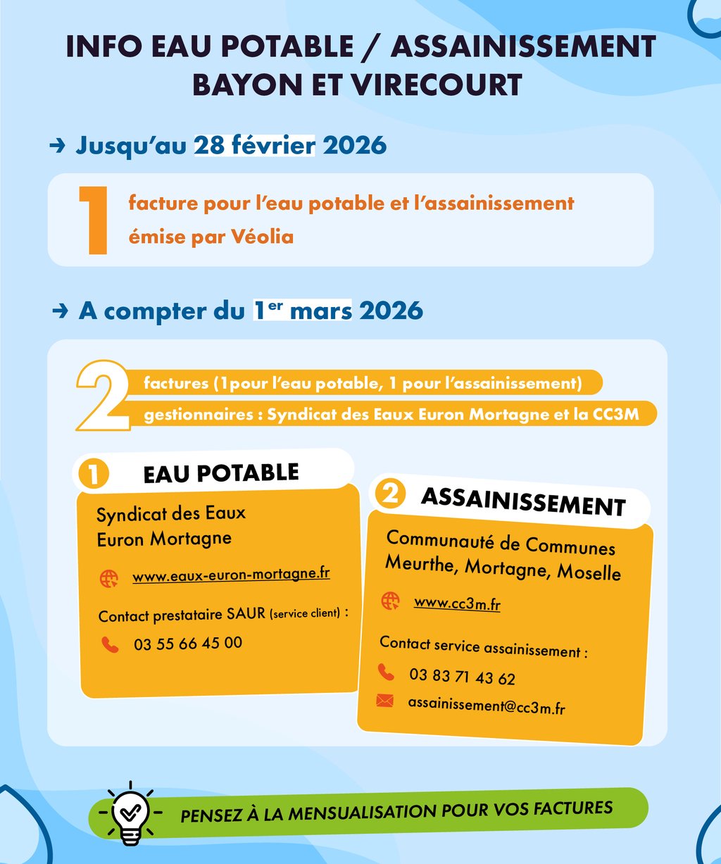Les habitants des communes de Bayon et Virecourt vont connaître un changement dans leur facturation d'eau potable et d'assainissement au mois de mars.