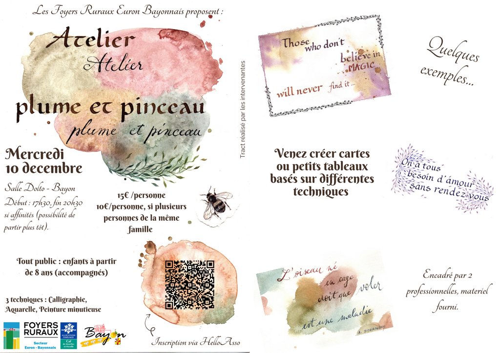 Inscription via HelloAsso : https://www.helloasso.com/associations/foyers-ruraux-euron-bayonnais/evenements/atelier-plume-et-pinceau-10-decembre