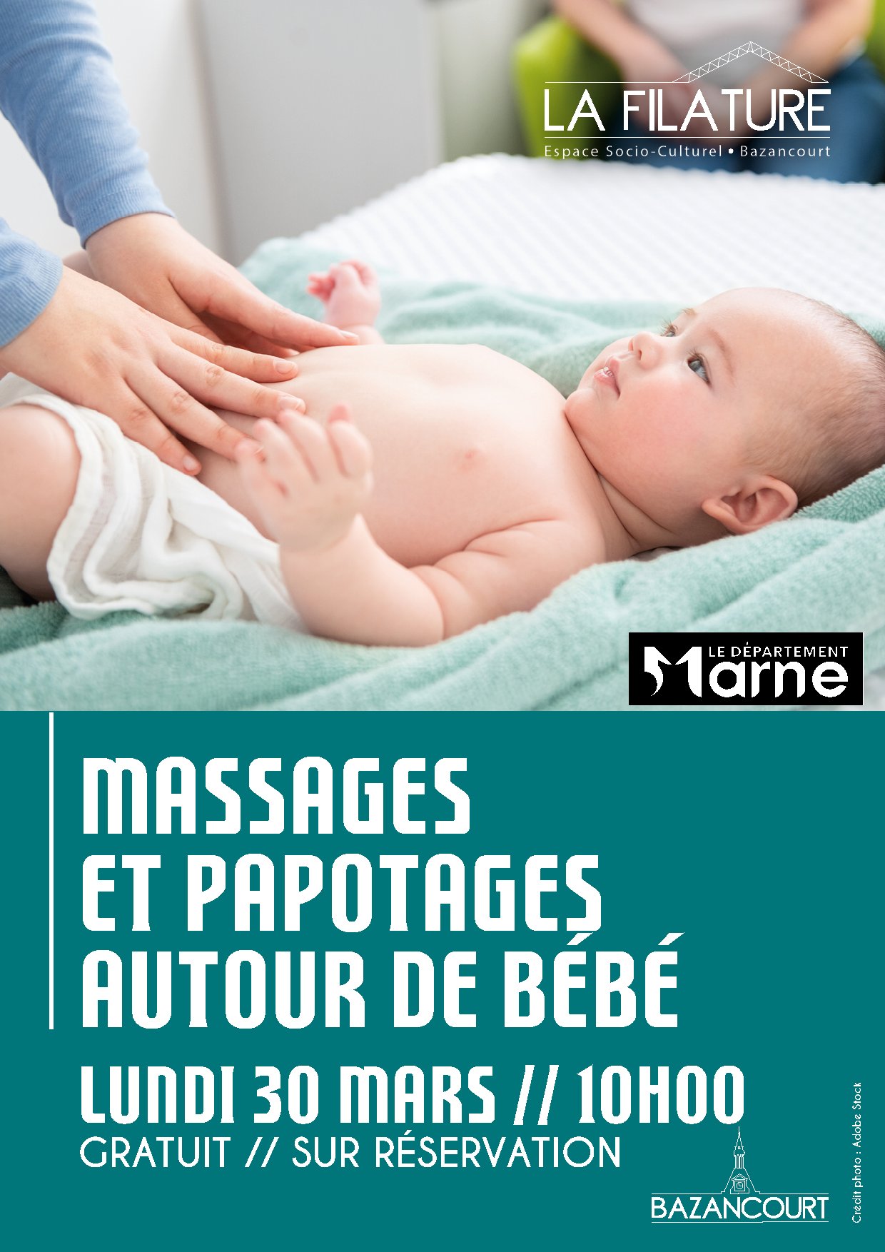 Le massage pour bébé est l’art d’utiliser le toucher afin de renforcer le lien avec son enfant et communiquer avec lui. Cet atelier est également une belle occasion d’échanger avec d’autres parents sur les préoccupations du quotidien.
