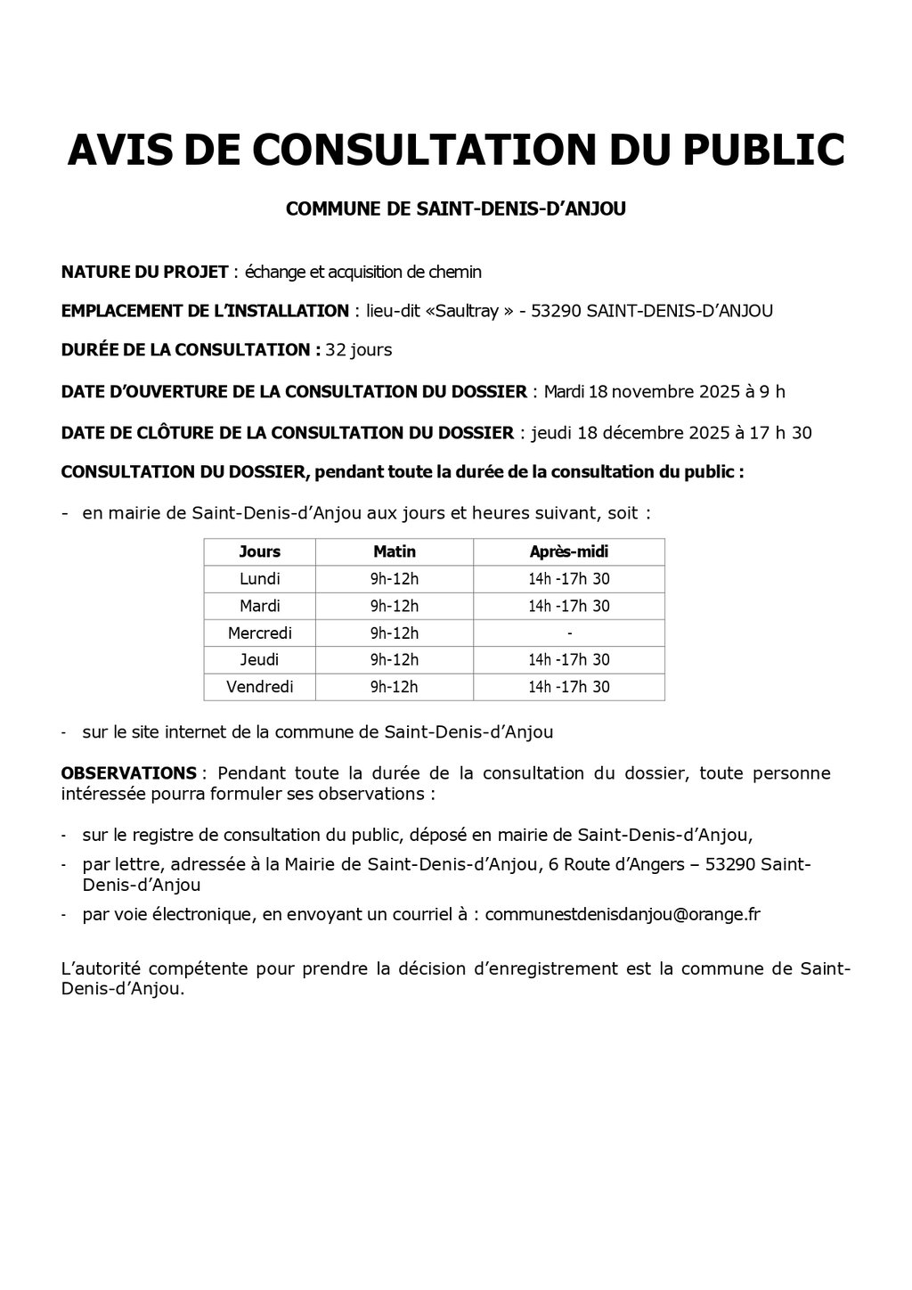 – sur le registre de consultation du public, déposé en mairie de Saint-Denis-d’Anjou,