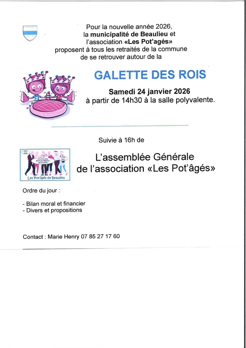 Pour la nouvelle année 2026, la municipalité de Beaulieu et l'association "Les Pot'âgés" proposent à tous les retraités de la commune de se retrouver autour de la GALETTE DES ROIS le samedi 24 janvier 2026 à partir de 14h30 à la salle polyvalente.