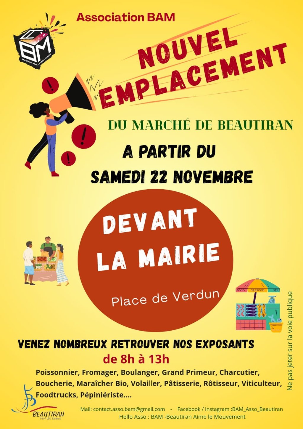 L'association Bam organise, tous les samedis, le marché communal, qui a lieu de 8 h à 13 h. Il a lieu désormais Place de Verdun.
