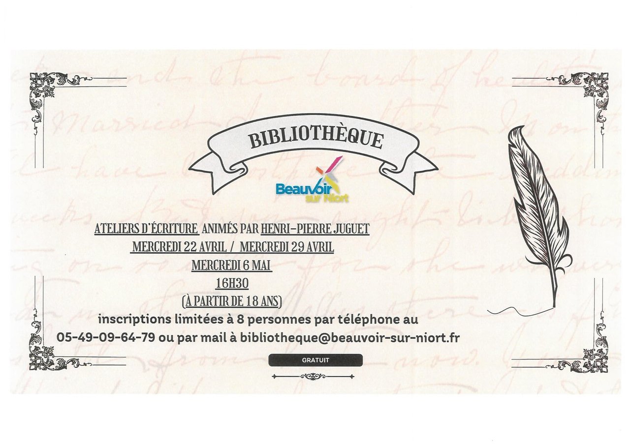 Inscription au 05.49.09.64.79 ou par mail bibliotheque@beauvoir-sur-niort.fr