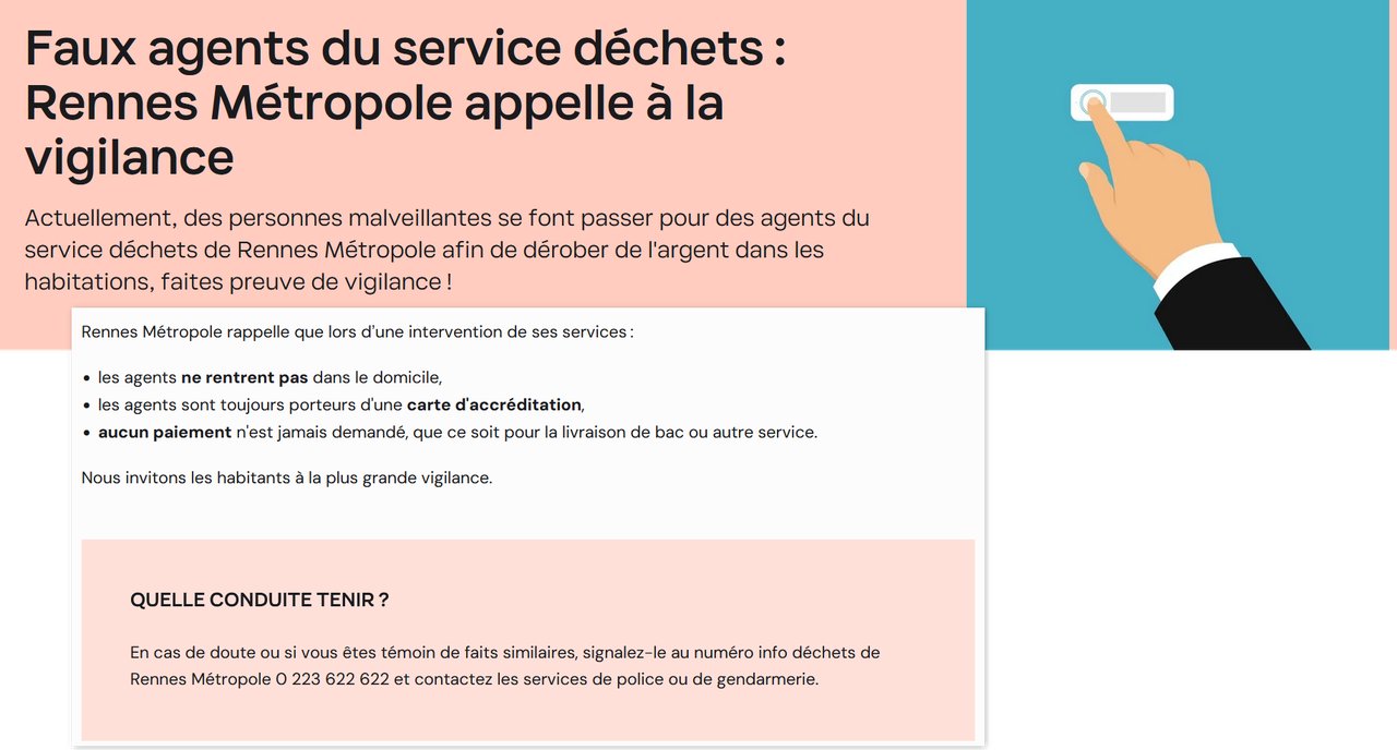 Actuellement, des personnes malveillantes se font passer pour des agents du service déchets de Rennes Métropole afin de dérober de l'argent dans les habitations, faites preuve de vigilance !