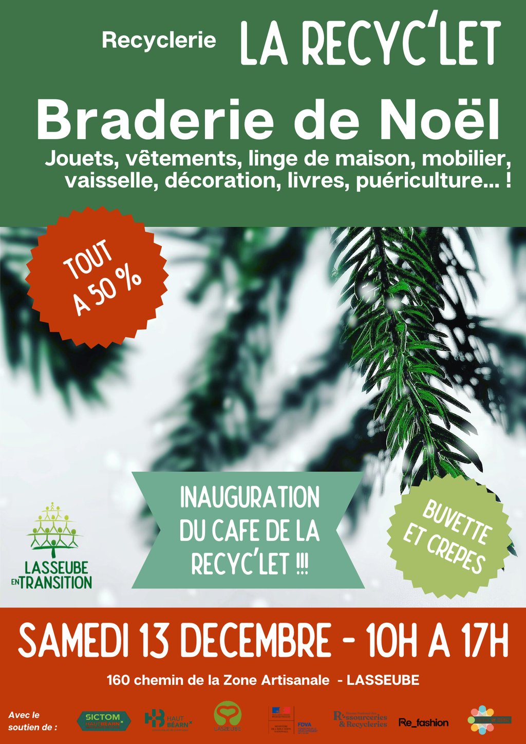 Le samedi 13 décembre 2025, de 10h à 17h (sans interruption), l'association Lasseube En Transition organise sa prochaine braderie ! Tout le stock sera à -50 % !