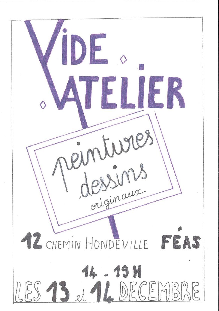 Un Vide Atelier Peintures et Dessins se tient samedi 13 et dimanche 14 décembre de 14h à 19h au 12 chemin Hondeville à Féas.