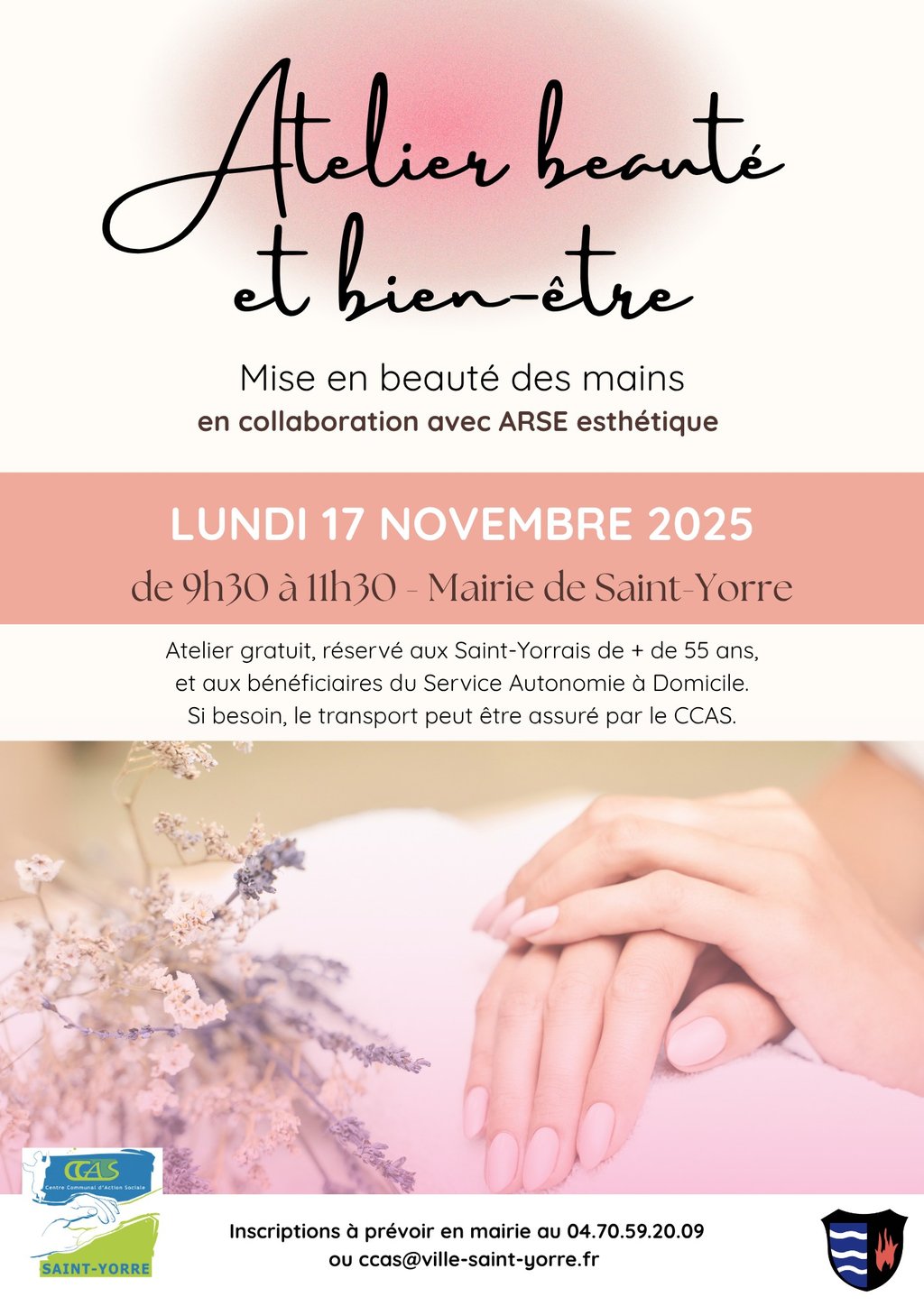 Un atelier "Mise en beauté des mains" est proposé par le CCAS de Saint-Yorre le 17 novembre de 9h30 à 11h30.