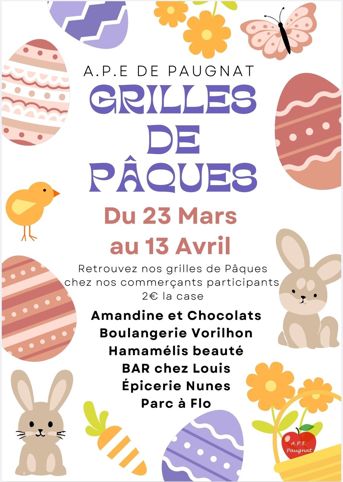 L'APE de Paugnat organise sa traditionnelle Grilles de Pâques pour gagner des lots chez nos commerçants de Paugnat.