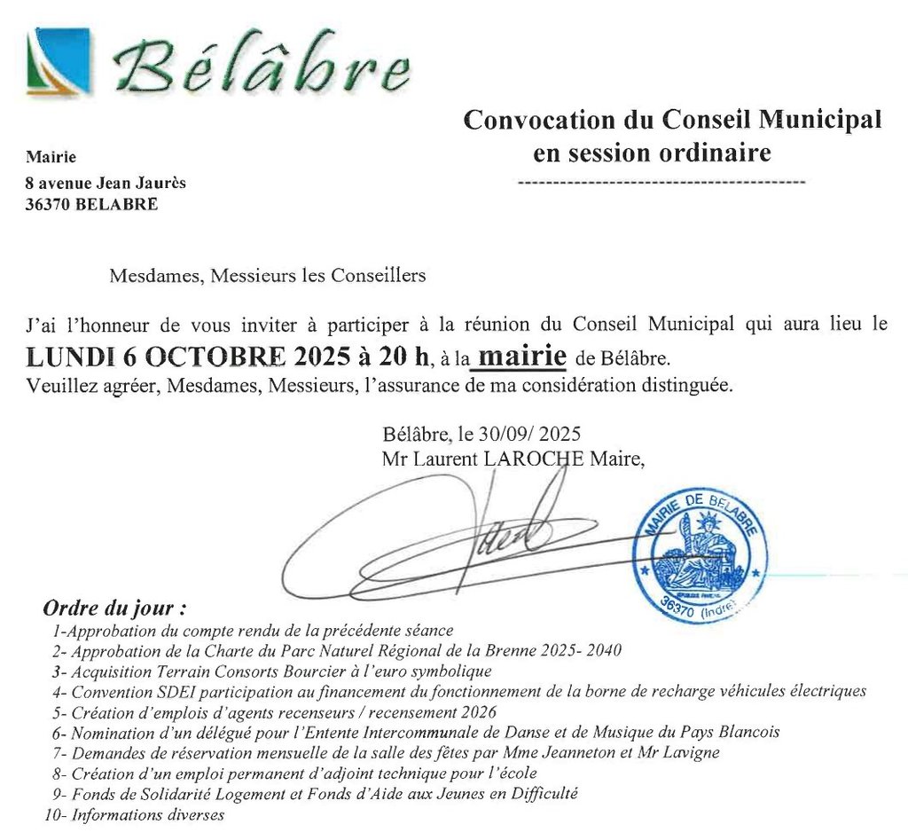 Conseil Municipal lundi 6 octobre 2025 à 20h Mairie de Bélâbre.