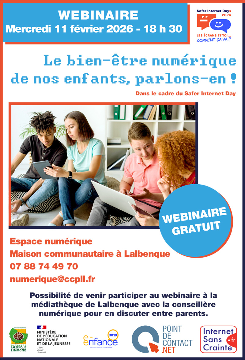 Gratuit, il se déroulera mercredi 11 février 2026, à 18h30, à l'espace numérique de la Maison communautaire de Lalbenque. Possibilité de venir participer au webinaire à la médiathèque de Lalbenque, avec la Conseillère numérique pour en discuter entre parents.