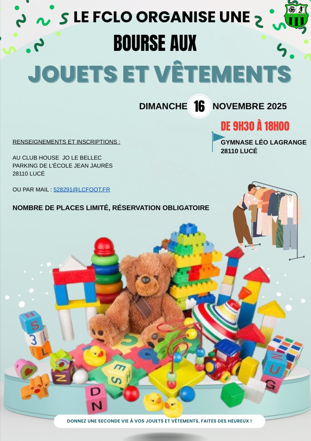 Le Football Club de Lucé Ouest organise une bourse aux jouets et vêtements le dimanche 16 novembre 2025, de 9h30 à 18h00 au gymnase Léo Lagrange.