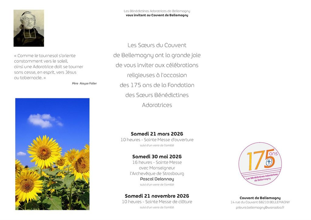 À cette occasion, trois célébrations auront lieu dans notre chapelle ou, si le temps le permet, dans le jardin du couvent.
