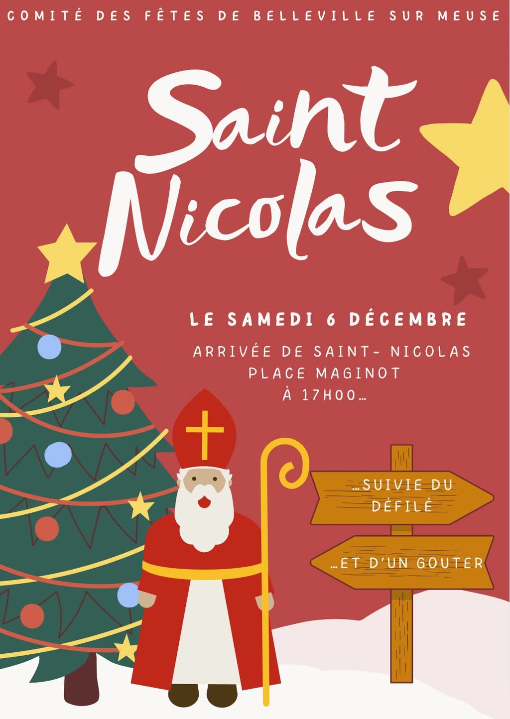 Saint Nicolas et le Père Fouettard arriveront le samedi 6 décembre 2025, place Maginot à 17h. Suivi d'un défilé jusqu'aux locaux du Comité des Fêtes de Belleville, où les clés de la ville lui seront remises par Mme le Maire. Un goûter sera offert aux petits et aux grands.