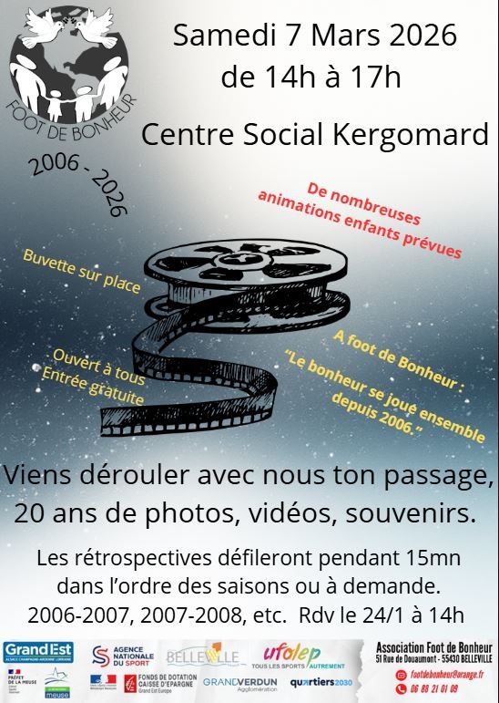Dans le cadre des 20 ans de l'association, Foot de Bonheur poursuit son parcours d'animation à destination du grand public, de ses adhérents et nombreux partenaires. Après le Lieu 9/1/2026 la 2ème étape nous emmène au Centre Social Kergomard. Au-delà des présentations (films, vidéos) de nombreuses animations pour les enfants seront proposées, buvette et petite restauration.