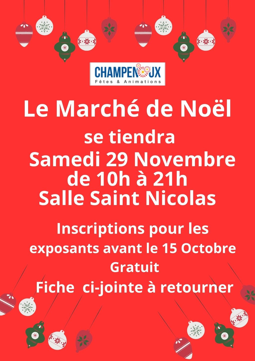 Le Marché de Noël 🎅 se tiendra le samedi 29 novembre de 10h à 21h, salle Saint Nicolas.